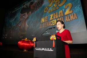 (250930) -- CIUDAD DE PANAMA, 30 septiembre, 2025 (Xinhua) -- Imagen del 29 de septiembre de 2025 de la embajadora de China en Panamá, Xu Xueyuan, pronunciando un discurso durante la presentación de la película china de animación "Ne Zha 2: El renacer del alma", en la Ciudad de Panamá, capital de Panamá. La película china de animación "Ne Zha 2: El renacer del alma", una de las más taquilleras del mundo en 2025, fue presentada el lunes al público en el Cinemark Pacific Center de la capital panameña. (Xinhua/Daniel González) (dg) (oa) (ah) (vf)