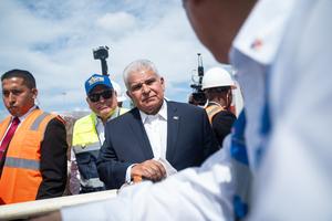 (251219) -- CIUDAD DE PANAMA, 19 diciembre, 2025 (Xinhua) -- Imagen cedida por el Consorcio Panamá Cuarto Puente del 18 de diciembre de 2025 del presidente panameño, José Raúl Mulino (d), conversando con trabajadores durante un recorrido en el sitio de construcción del cuarto puente sobre el Canal de Panamá, en la Ciudad de Panamá, capital de Panamá. Mulino destacó el avance del 30 por ciento que registran hasta el momento las obras del cuarto puente sobre el Canal de Panamá, una infraestructura clave que conectará la capital con el oeste del país. (Xinhua/Consorcio Panamá Cuarto Puente) (oa) (ra) (vf)