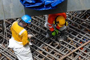 (251102) -- CIUDAD DE PANAMA, 2 noviembre, 2025 (Xinhua) -- Imagen del 1 de noviembre de 2025 de empleados trabajando en la construcción del Cuarto Puente sobre el Canal de Panamá, en la Ciudad de Panamá, capital de Panamá. El vaciado de concreto del cabezal de pilotes de la Torre Principal Este conocida como M3 del Cuarto Puente sobre el Canal de Panamá inició el pasado sábado, lo que marca un nuevo hito en la construcción de la obra más importante del país de América Central, según la expresión de las autoridades panameñas. (Xinhua/Daniel González) (dg) (rtg) (ah)
