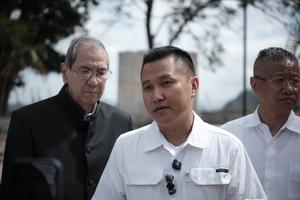 (260331) -- CIUDAD DE PANAMA, 31 marzo, 2026 (Xinhua) -- Imagen del 30 de marzo de 2026 del representante de la Cámara China Panameña de Comercio e Industrias, Jaime Chung (frente), hablando durante la conmemoración del Día de la Etnia China frente al sitio donde se encontraba el monumento conmemorativo al 150º aniversario de la llegada de los primeros inmigrantes chinos a Panamá, en el mirador del Puente de las Américas, en la ribera occidental del Canal de Panamá, en la Ciudad de Panamá, capital de Panamá. Los aportes y el legado histórico de la comunidad china en Panamá, así como su integración a la sociedad, fueron destacados el lunes durante la conmemoración del Día de la Etnia China, en un acto celebrado en donde se encontraba el monumento conmemorativo al 150º aniversario de la llegada de los primeros inmigrantes chinos al país (1854-2004). (Xinhua/Xu Yongzheng) (ah) (ra) (vf)