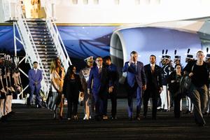 (250408) -- CIUDAD DE PANAMA, 8 abril, 2025 (Xinhua) -- Imagen del 7 de abril de 2025 del secretario de Defensa de Estados Unidos, Pete Hegseth (4-d), saludando a su llegada al Aeropuerto Internacional Panamá Pacífico, en el distrito de Arraiján, cerca de la Ciudad de Panamá, capital de Panamá. (Xinhua/Daniel González) (jg) (ra) (ce)