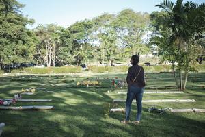(251221) -- CIUDAD DE PANAMA, 21 diciembre, 2025 (Xinhua) -- Imagen del 20 de diciembre de 2025 de una mujer visitando la tumba de su hermano durante un acto conmemorativo por las personas fallecidas durante la invasión estadounidense a Panamá de 1989 en el cementerio Jardín de Paz, en la Ciudad de Panamá, capital de Panamá. Centenares de panameños participaron el sábado en un acto solemne para conmemorar los 36 años de la invasión estadounidense a Panamá, ocurrida el 20 de diciembre de 1989. (Xinhua/Xu Yongzheng) (ah) (da)