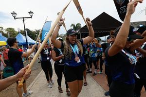(260427) -- CIUDAD DE PANAMA, 27 abril, 2026 (Xinhua) -- Imagen del 26 de abril de 2026 de atletas festejando durante la ceremonia de premiación de la décima edición Festival de Botes de Dragón, en la Ciudad de Panamá, capital de Panamá. El Festival de Botes de Dragón arribó a su décima edición como puente entre las familias de la comunidad chino-panameña a través de esa milenaria tradición, disputada el fin de semana en la Calzada Amador, en la capital de Panamá, señalaron los organizadores. (Xinhua/Daniel González) (dg) (ah) (ce)
