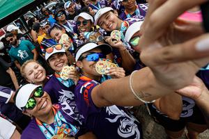 (260427) -- CIUDAD DE PANAMA, 27 abril, 2026 (Xinhua) -- Imagen del 26 de abril de 2026 de atletas tomándose fotografías con sus medallas de oro durante la ceremonia de premiación de la décima edición Festival de Botes de Dragón, en la Ciudad de Panamá, capital de Panamá. El Festival de Botes de Dragón arribó a su décima edición como puente entre las familias de la comunidad chino-panameña a través de esa milenaria tradición, disputada el fin de semana en la Calzada Amador, en la capital de Panamá, señalaron los organizadores. (Xinhua/Daniel González) (dg) (ah) (ce)