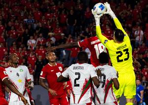 (251015) -- CIUDAD DE PANAMA, 15 octubre, 2025 (Xinhua) -- Imagen del 14 de octubre de 2025 del jugador Cecilio Waterman (2-d-arriba), de Panamá, disputando el balón con el guardameta Etienne Vaessen (d-arriba), de Surinam, durante el partido correspondiente a las Eliminatorias para el Mundial de Estados Unidos, México y Canadá 2026, celebrado en el Estadio Rommel Fernández, en la Ciudad de Panamá, capital de Panamá. (Xinhua/Xu Yongzheng) (ah) (ra) (vf)
