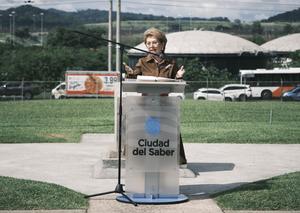 (251023) -- CIUDAD DE PANAMA, 23 octubre, 2025 (Xinhua) -- La expresidenta panameña, Mireya Moscoso, pronuncia un discurso durante la ceremonia de la "Siembra de Banderas", en la Ciudad de Panamá, capital de Panamá, el 23 de octubre de 2025. Los panameños realizaron el jueves la tradicional e histórica "Siembra de Banderas", un evento anual celebrado en la Ciudad del Saber, en recuerdo de la gesta patriótica del 2 de mayo de 1958, cuando un grupo de estudiantes colocó 65 banderas panameñas en puntos emblemáticos de la desaparecida Zona del Canal, entonces bajo control de Estados Unidos. (Xinhua/Xu Yongzheng) (rtg) (ra) (ce)
