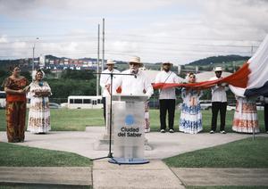 (251023) -- CIUDAD DE PANAMA, 23 octubre, 2025 (Xinhua) -- Jorge Arosemena (c-frente), presidente ejecutivo de la Fundación Ciudad del Saber, pronuncia un discurso durante la ceremonia de la "Siembra de Banderas", en la Ciudad de Panamá, capital de Panamá, el 23 de octubre de 2025. Los panameños realizaron el jueves la tradicional e histórica "Siembra de Banderas", un evento anual celebrado en la Ciudad del Saber, en recuerdo de la gesta patriótica del 2 de mayo de 1958, cuando un grupo de estudiantes colocó 65 banderas panameñas en puntos emblemáticos de la desaparecida Zona del Canal, entonces bajo control de Estados Unidos. (Xinhua/Xu Yongzheng) (rtg) (ra) (ce)
