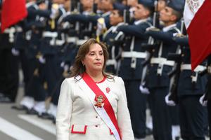 (250728) -- LIMA, 28 julio, 2025 (Xinhua) -- La presidenta de Perú, Dina Boluarte, pasa revista a una guardia de honor al llegar al Congreso para dar un discurso a la nación con motivo de las Fiestas Patrias, en Lima, Perú, el 28 de julio de 2025. (Xinhua/Mariana Bazo) (mb) (rtg) (ah) (ce)