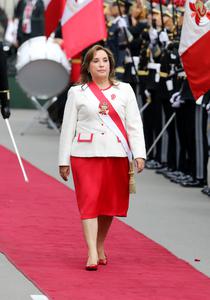 (250728) -- LIMA, 28 julio, 2025 (Xinhua) -- La presidenta de Perú, Dina Boluarte, pasa revista a una guardia de honor al llegar al Congreso para dar un discurso a la nación con motivo de las Fiestas Patrias, en Lima, Perú, el 28 de julio de 2025. (Xinhua/Mariana Bazo) (mb) (rtg) (ah) (ce)