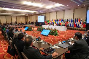 (251001) -- LIMA, 1 octubre, 2025 (Xinhua) -- Imagen proveída por la Presidencia de Perú de la ceremonia de inauguración de la XXIV Reunión del Foro de Ministras y Ministros de Medio Ambiente de América Latina y el Caribe, en Lima, Perú, el 1 de octubre de 2025. La presidenta de Perú, Dina Boluarte, inauguró el miércoles en la ciudad de Lima, la XXIV Reunión del Foro de Ministras y Ministros de Medio Ambiente de América Latina y el Caribe, donde aseguró que el foro representa un "llamado de urgencia" para cuidar la Amazonia. (Xinhua/Presidencia de Perú) (ah) (ce)