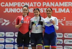 (250721) -- LIMA, 21 julio, 2025 (Xinhua) -- Imagen del 20 de julio de 2025 de la medallista de plata, Marlen Rojas (i), de Chile, la medallista de oro, Luciana Osorio (c), de Colombia y la medallista de bronce, Olviángel Castillo (d), de Venezuela, posando durante la ceremonia de premiación de la prueba de Omnium por puntos de 15 km femenina del Campeonato Panamericano Juvenil de Ciclismo de Pista, en el velódromo de la Villa Deportiva Nacional, en Lima, Perú. (Xinhua/Mariana Bazo) (mb) (rtg) (ah) (ce)
