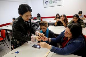 (250506) -- LIMA, 6 mayo, 2025 (Xinhua) -- Imagen del 5 de mayo de 2025 de una profesora enseñando a alumnas a hacer nudos en el taller "El arte de los nudos chinos" organizado por el Instituto Confucio de la Pontificia Universidad Católica del Perú (PUCP), en Lima, Perú. Peruanos participaron el lunes en el taller "El arte de los nudos chinos", organizado por el Instituto Confucio de la PUCP, para impulsar un mayor acercamiento de los ciudadanos de este país andino a la cultura china. (Xinhua/Mariana Bazo) (mb) (jg) (ra) (ce)