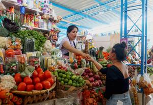 (251220) -- LIMA, 20 diciembre, 2025 (Xinhua) -- Una vendedora atiende a una clienta en un puesto de verduras de un mercado, en el distrito de San Bartolo, en el sur de Lima, Perú, el 20 de diciembre 2025. El Banco Central de Reserva de Perú elevó de 3,2 a 3,3 por ciento la proyección de crecimiento de la economía peruana al cierre de este 2025, mientras que para 2026 ajustó al alza la estimación de 2,9 a 3 por ciento, informó el viernes el presidente del ente emisor, Julio Velarde. (Xinhua/Mariana Bazo) (mb) (jg) (da)
