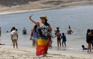 (250224) -- LIMA, 24 febrero, 2025 (Xinhua) -- Imagen del 23 de febrero de 2025 de una mujer tomándose una fotografía en la playa El Silencio, en el sur de Lima, Perú. La economía de Perú podría crecer al menos un 4 por ciento este 2025, con lo que superaría el 3,3 por ciento de crecimiento que alcanzó en 2024, proyectó el lunes el ministro de Economía y Finanzas, José Salardi. (Xinhua/Mariana Bazo) (mb) (oa) (ah) (vf)