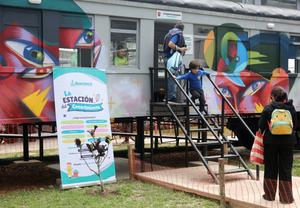 (251002) -- LIMA, 2 octubre, 2025 (Xinhua) -- Imagen del 1 de octubre de 2025 de un niño saliendo de la "Estación del Conocimiento", en Lima, Perú. Los niños peruanos cuentan con un nuevo espacio dinámico para reforzar su aprendizaje, localizado en el distrito de Barranco, en la ciudad de Lima, donde de manera reciente fue inaugurada la "Estación del Conocimiento", un vagón de ferrocarril acondicionado para convertirse en centro educativo. (Xinhua/Mariana Bazo) (mb) (rtg) (ra) (ce)