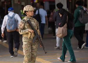 (251022) -- LIMA, 22 octubre, 2025 (Xinhua) -- Una integrante de la Fuerza Aérea del Perú monta guardia en la estación La Cultura del Metro de Lima, en Lima, Perú, el 22 de octubre de 2025. El presidente de Perú, José Jerí, anunció el martes la declaratoria de emergencia en Lima Metropolitana y su vecina provincia del Callao, por un periodo de 30 días calendario, con el objetivo de enfrentar los altos índices de criminalidad e inseguridad que afronta la nación sudamericana. (Xinhua/Mariana Bazo) (mb) (ah) (ra) (ce)