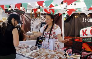 (250404) -- LIMA, 4 abril, 2025 (Xinhua) -- Una vendedora porta un traje típico mientras atiende a una clienta en la feria turística "I Expo Pozuzo 2025" que promueve los productos artesanales y gastronómicos de la región selvática donde se encuentran dos colonias austro-alemanas fundadas en el siglo XIX, en Lima, Perú, el 4 de abril de 2025. (Xinhua/Mariana Bazo) (mb) (oa) (da) (ce)
