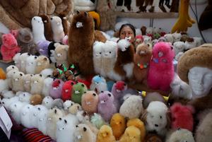 (250620) -- LIMA, 20 junio, 2025 (Xinhua) -- Una vendedora de juguetes de alpaca espera por clientes en un estand en la Feria Artesanal Manos Peruanas, en el distrito de Barranco, en Lima, Perú, el 20 de junio de 2025. (Xinhua/Mariana Bazo) (mb) (oa) (da) (ce)