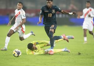 (250611) -- LIMA, 11 junio, 2025 (Xinhua) -- Imagen del 10 de junio de 2025 del guardameta, Pedro Gallese (abajo), de Perú, disputando el balón con Nilson Angulo (frente), de Ecuador, durante el partido correspondiente a las Eliminatorias Sudamericanas para el Mundial de Estados Unidos, México y Canadá 2026 celebrado en el Estadio Nacional, en Lima, Perú. (Xinhua/Mariana Bazo) (mb) (jg) (da) (ce)