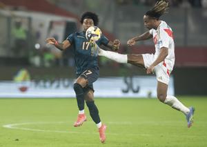 (250611) -- LIMA, 11 junio, 2025 (Xinhua) -- Imagen del 10 de junio de 2025 de André Carrillo (d), de Perú, disputando el balón con Angelo Preciado (i), de Ecuador, durante el partido correspondiente a las Eliminatorias Sudamericanas para el Mundial de Estados Unidos, México y Canadá 2026 celebrado en el Estadio Nacional, en Lima, Perú. (Xinhua/Mariana Bazo) (mb) (jg) (da) (ce)