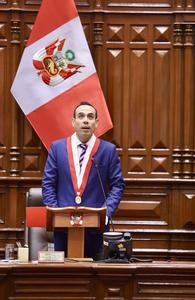 (250726) -- LIMA, 26 julio, 2025 (Xinhua) -- Imagen proveída por el Congreso de la República de Perú del legislador José Jerí, del partido conservador Somos Perú, hablando durante su nombramiento como presidente del Congreso de Perú, en Lima, Perú, el 26 de julio de 2025. Jerí asumió el sábado la presidencia del Congreso peruano para el periodo legislativo 2025-2026, luego de que la lista que conformó su propuesta de Mesa Directiva obtuviera 79 votos a favor en una elección interna. (Xinhua/Congreso de la República de Perú) (oa) (da)