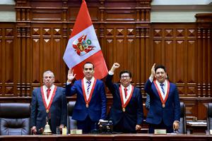 (250726) -- LIMA, 26 julio, 2025 (Xinhua) -- Imagen proveída por el Congreso de la República de Perú del legislador José Jerí (2-i), del partido conservador Somos Perú, reaccionando durante su nombramiento como presidente del Congreso de Perú, en Lima, Perú, el 26 de julio de 2025. Jerí asumió el sábado la presidencia del Congreso peruano para el periodo legislativo 2025-2026, luego de que la lista que conformó su propuesta de Mesa Directiva obtuviera 79 votos a favor en una elección interna. (Xinhua/Congreso de la República de Perú) (oa) (da)
