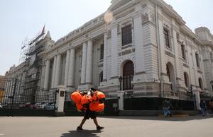 (251010) -- LIMA, 10 octubre, 2025 (Xinhua) -- Un vendedor de piñatas camina frente al Edificio del Congreso durante el primer día de Gobierno del presidente peruano, José Jerí, en Lima, Perú, el 10 de octubre de 2025. Jerí asumió la madrugada del viernes la Presidencia de la nación sudamericana, luego de que el Congreso decidiera con 122 votos destituir del cargo a Dina Boluarte. (Xinhua/Mariana Bazo) (mb) (rtg) (ra) (ce)