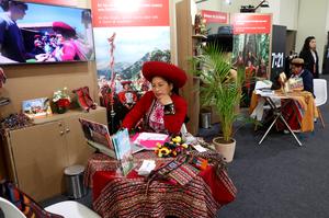(250628) -- LIMA, 28 junio, 2025 (Xinhua) -- Una expositora espera por visitantes en un estand durante el evento Perú Travel Mart 2025, en Lima, Perú, el 28 de junio de 2025. La presidenta de Perú, Dina Boluarte, afirmó el viernes que la nueva edición del Perú Travel Mart constituye una "ventana" estratégica del país andino para consolidar nuevas alianzas comerciales con el mundo en el sector turístico. (Xinhua/Mariana Bazo) (mb) (oa) (da)