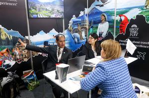 (250628) -- LIMA, 28 junio, 2025 (Xinhua) -- Un expositor conversa con una visitante en un estand durante el evento Perú Travel Mart 2025, en Lima, Perú, el 28 de junio de 2025. La presidenta de Perú, Dina Boluarte, afirmó el viernes que la nueva edición del Perú Travel Mart constituye una "ventana" estratégica del país andino para consolidar nuevas alianzas comerciales con el mundo en el sector turístico. (Xinhua/Mariana Bazo) (mb) (oa) (da)