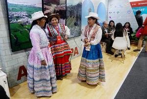 (250628) -- LIMA, 28 junio, 2025 (Xinhua) -- Expositoras participan en el evento Perú Travel Mart 2025, en Lima, Perú, el 28 de junio de 2025. La presidenta de Perú, Dina Boluarte, afirmó el viernes que la nueva edición del Perú Travel Mart constituye una "ventana" estratégica del país andino para consolidar nuevas alianzas comerciales con el mundo en el sector turístico. (Xinhua/Mariana Bazo) (mb) (oa) (da)