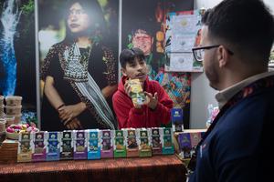 (250720) -- LIMA, 20 julio, 2025 (Xinhua) -- Imagen del 18 de julio de 2025 de un expositor mostrando chocolates a un cliente en un estand del XVI Salón del Cacao y Chocolate 2025 en el Centro de Convenciones de Lima, en Lima, Perú. Perú busca fortalecer la exportación chocolatera con la realización del XVI Salón del Cacao y Chocolate 2025 desarrollado del 17 al 20 de julio en el Centro de Convenciones de la ciudad de Lima. (Xinhua/Mariana Bazo) (mb) (rtg) (da)