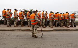 (250615) -- LIMA, 15 junio, 2025 (Xinhua) -- Soldados del Ejército peruano esperan para ingresar a limpiar piedras y escombros caídos después de un sismo de magnitud 6,1 en la escala de Richter, en el acantilado de la Costa Verde, en el distrito de Chorrillos, en Lima, Perú, el 15 de junio de 2025. Un sismo de magnitud 6,1 en la escala de Richter sacudió el domingo de manera intensa la capital peruana con epicentro en la provincia del Callao (centro), vecina a Lima, sin que hasta el momento se reporten daños materiales o personales, confirmó el Centro Sismológico Nacional. (Xinhua/Mariana Bazo) (mb) (rtg) (da)