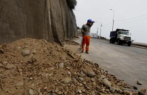 (250615) -- LIMA, 15 junio, 2025 (Xinhua) -- Un trabajador limpia piedras y escombros caídos después de un sismo de magnitud 6,1 en la escala de Richter, en el acantilado de la Costa Verde, en el distrito de Chorrillos, en Lima, Perú, el 15 de junio de 2025. Un sismo de magnitud 6,1 en la escala de Richter sacudió el domingo de manera intensa la capital peruana con epicentro en la provincia del Callao (centro), vecina a Lima, sin que hasta el momento se reporten daños materiales o personales, confirmó el Centro Sismológico Nacional. (Xinhua/Mariana Bazo) (mb) (rtg) (da)