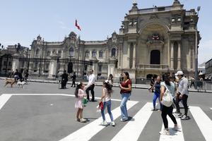 (250122) — LIMA, 22 enero, 2025 (Xinhua) — Turistas caminan frente al Palacio de Gobierno en la Plaza Mayor, en Lima, Perú, el 22 de enero de 2025. (Xinhua/Mariana Bazo) (mb) (ah) (ra) (vf)