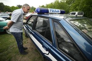 (250504) — VARSOVIA, 4 mayo, 2025 (Xinhua) — Imagen del 3 de mayo de 2025 de un hombre observando un automóvil de policía durante el quinto Rally Polonez, en Varsovia, Polonia. El evento reunió a entusiastas de los automóviles clásicos hechos en Polonia, para exhibir modelos clásicos como el Polonez y el Polski Fiat 125p, ambos fabricados por la industria automotriz polaca, alrededor de la década de 1970. (Xinhua/Jaap Arriens) (rtg) (da)