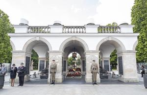 (250508) -- VARSOVIA, 8 mayo, 2025 (Xinhua) -- Una ceremonia para conmemorar el 80 aniversario del fin de la Segunda Guerra Mundial en Europa, conocido como el Día de la Victoria en Europa, se lleva a cabo en la Tumba del Soldado Desconocido, en Varsovia, Polonia, el 8 de mayo de 2025. (Xinhua/Zhang Fan) (rtg) (ra) (ce)