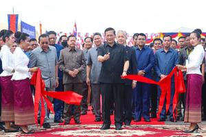 (250413) -- TBONG KHMUM, April 13, 2025 (Xinhua) -- Cambodian Prime Minister Hun Manet (C, front) cuts the ribbon to inaugurate the National Road 71C in Tbong Khmum province, Cambodia, April 12, 2025.