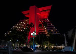 (250128) -- DOHA, 28 enero, 2025 (Xinhua) -- Imagen del 28 de enero de 2025 del Hotel Sheraton iluminado en celebración del Año Nuevo chino, en Doha, Qatar. (Xinhua/Nikku) (jg) (ra) (vf)
