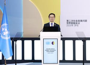 (251105) -- DOHA, 5 noviembre, 2025 (Xinhua) -- El vicepresidente chino, Han Zheng, habla en el debate general de la actual Segunda Cumbre Mundial sobre Desarrollo Social, en Doha, Qatar, el 4 de noviembre de 2025. (Xinhua/Wang Ye) (jg) (da) (ce)