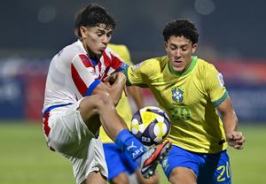 (251115) -- DOHA, 15 noviembre, 2025 (Xinhua) -- Imagen del 14 de noviembre de 2025 de Felipe Morais (d), de Brasil, disputando el balón con Thiago Aranda, de Paraguay, durante el partido de fútbol de dieciseisavos de final entre Brasil y Paraguay en la Copa Mundial Sub-17 de la FIFA Qatar 2025, en Doha, Qatar. (Xinhua/Nikku) (oa) (da)