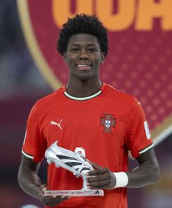 (251128) -- DOHA, 28 noviembre, 2025 (Xinhua) -- Imagen del 27 de noviembre de 2025 de Anisio Cabral, de Portugal, posando para una fotografía con el premio Bota de Plata en el podio al término del partido final entre Portugal y Austria en la Copa Mundial Sub-17 de la FIFA Qatar 2025, en Doha, Qatar. Portugal ganó 1-0. (Xinhua/Nikku) (rtg) (ra) (vf)