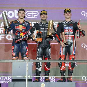 (250414) -- DOHA, 14 abril, 2025 (Xinhua) -- Imagen del 13 de abril de 2025 del ganador del primer lugar, el piloto español de Moto2 del equipo Fantic Racing Lino Sonego, Aaron Canet (c), el ganador del segundo lugar, el piloto japonés de Moto2 del equipo Red Bull KTM Ajo, Deniz Oncu (i), y el ganador del tercer lugar, el piloto español de Moto2 del equipo Liqui Moly Dynavolt Intact GP, Manuel González, festejando en el podio al término de la carrera de Moto2 del Gran Premio de Qatar de MotoGP 2025, en el Circuito de Lusail, en Doha, Qatar. (Xinhua/Nikku) (rtg) (ah) (vf)