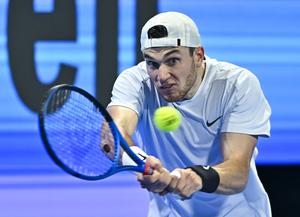 (250221) — DOHA, 21 febrero, 2025 (Xinhua) — Imagen del 20 de febrero de 2025 de Jack Draper, de Reino Unido, devolviendo la pelota durante el partido de cuartos de final de individuales masculinos ante Matteo Berrettini, de Italia, en el torneo de tenis Abierto de Qatar de la ATP, en Doha, Qatar. (Xinhua/Nikku) (rtg) (ra) (vf)