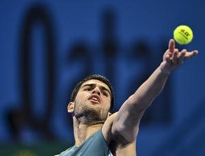 (250221) -- DOHA, 21 febrero, 2025 (Xinhua) -- Imagen del 20 de febrero de 2025 de Carlos Alcaraz, sirviendo la pelota durante el partido de cuartos de final de individuales masculinos entre Carlos Alcaraz, de España, y Jiri Lehecka, de República Checa, en el torneo de tenis Abierto de Qatar de la ATP, en Doha, Qatar. (Xinhua/Nikku) (rtg) (ra) (vf)