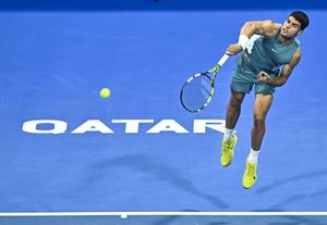 (250221) -- DOHA, 21 febrero, 2025 (Xinhua) -- Imagen del 20 de febrero de 2025 de Carlos Alcaraz, sirviendo la pelota durante el partido de cuartos de final de individuales masculinos entre Carlos Alcaraz, de España, y Jiri Lehecka, de República Checa, en el torneo de tenis Abierto de Qatar de la ATP, en Doha, Qatar. (Xinhua/Nikku) (rtg) (ra) (vf)