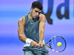 (250221) -- DOHA, 21 febrero, 2025 (Xinhua) -- Imagen del 20 de febrero de 2025 de Carlos Alcaraz, devolviendo la pelota durante el partido de cuartos de final de individuales masculinos entre Carlos Alcaraz, de España, y Jiri Lehecka, de República Checa, en el torneo de tenis Abierto de Qatar de la ATP, en Doha, Qatar. (Xinhua/Nikku) (rtg) (ra) (vf)