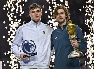 (250223) -- DOHA, 23 febrero, 2025 (Xinhua) -- Imagen del 22 de febrero de 2025 del ganador Andrey Rublev (d), de Rusia, y el subcampeón Jack Draper, de Reino Unido, posando con el trofeo durante la ceremonia de premiación después de su partido final de individuales masculinos en el torneo de tenis Abierto de Qatar de la ATP, en Doha, Qatar. (Xinhua/Nikku) (oa) (ah)
