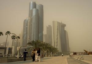 (250415) -- DOHA, 15 abril, 2025 (Xinhua) -- Personas caminan en medio de una densa nube de polvo, en Doha, Qatar, el 15 de abril de 2025. Una tormenta de arena azotó Doha el martes. (Xinhua/Nikku) (jg) (ra) (vf)