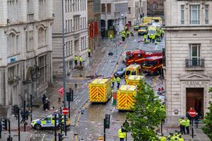 (250527) -- LIVERPOOL, 27 mayo, 2025 (Xinhua) -- Imagen del 26 de mayo de 2025 de oficiales de policía y trabajadores de emergencias vistos en el sitio de un incidente en el que un automóvil embistió a una multitud que celebraba la victoria del Club de Fútbol Liverpool en la Liga Premier, en Liverpool, Reino Unido. Decenas de personas, entre ellas cuatro niños, resultaron heridas después de que un auto embistió a la multitud que celebraba la victoria del Club de Fútbol Liverpool en la Liga Premier en la ciudad británica del mismo nombre, informaron el lunes los servicios de emergencia. (Xinhua) (oa) (ah) (ce)