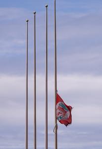 (250703) — LIVERPOOL, 3 julio, 2025 (Xinhua) — La bandera del Liverpool FC ondea a media asta afuera del estadio Anfield, en Liverpool, Reino Unido, el 3 de julio de 2025. El delantero internacional portugués Diogo Jota, del Liverpool, y su hermano André murieron en la madrugada del jueves en un accidente automovilístico en el noreste de España, según las autoridades españolas. (Xinhua) (rtg) (ra) (vf)
